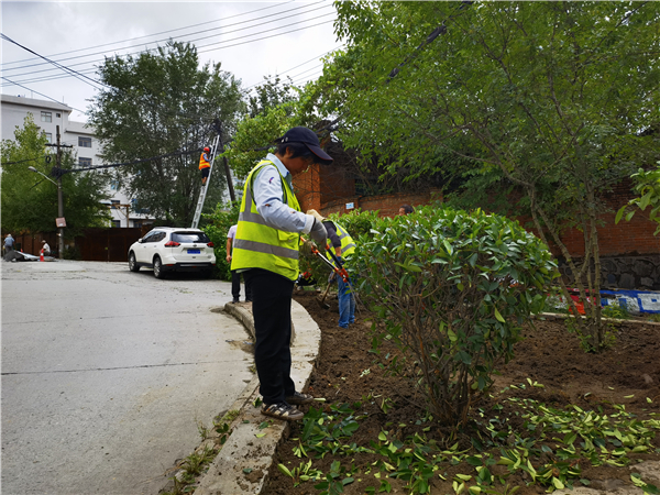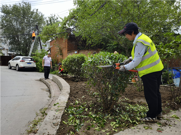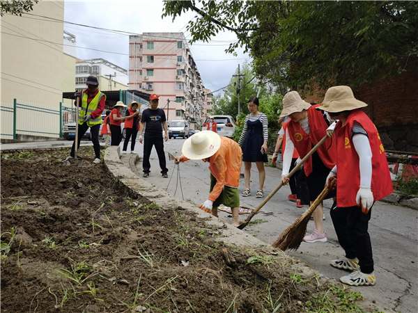 7月23日,前张岭社区志愿者和高新绿化工人联手整治群众占用的街心花园。(陈小勇)