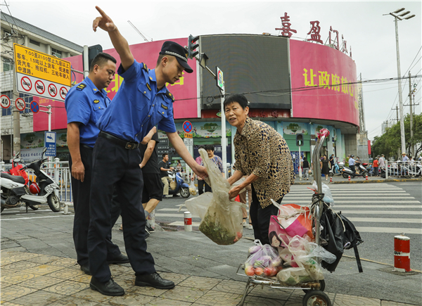 7月23日,江北交警、城管在中渡街整顿交通和农贸市场。(郭晓康)