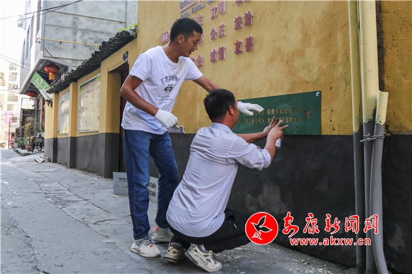 7月21日, 城区五星街社区组织人员,对五星街的背街小巷进行清理,粉刷墙面,书写标语。(李春江)