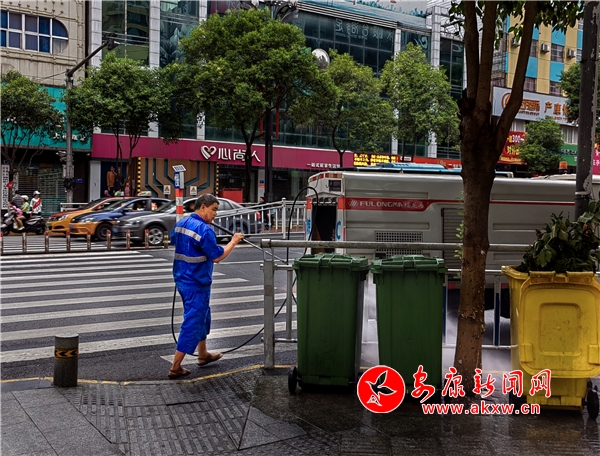 7月18日,环卫工人正在清洗垃圾桶、人行道。(袁满)