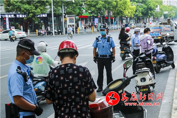 8 月1 日,交警中队派员在城区十字路口,检查违法违纪车辆。(李春江)