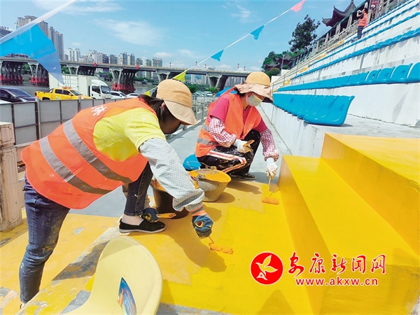 工人正在给看台刷漆8wd安康新闻网