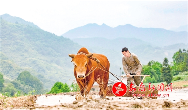 村民赶着牛在稻田里犁地4sF安康新闻网