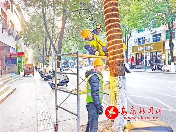 石泉县为营造绚丽多彩的城市夜景,在向阳大道两旁的景观树上安装LED灯带。杨勇 摄