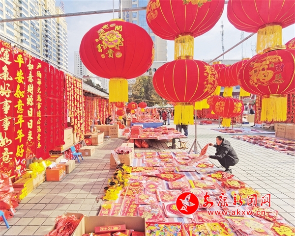 商贩在中心广场售卖春联、福字、红灯笼等节庆用品。吴定国 摄