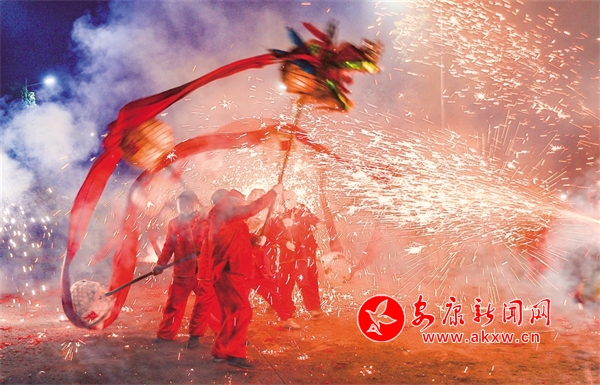 五里工业园区的“烧火龙”表演蔚为壮观。李成宝 摄