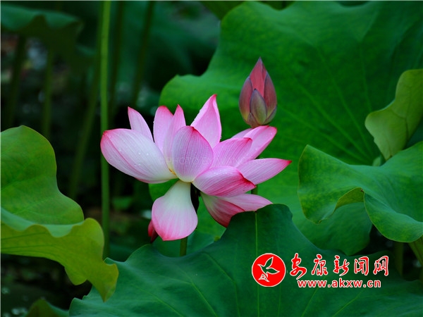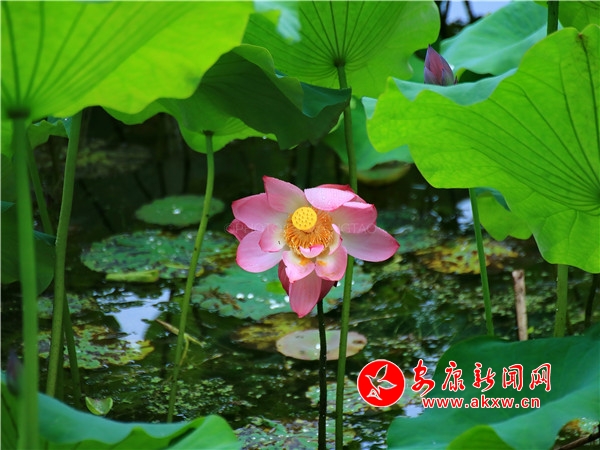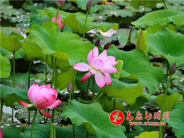 荷花开放娇艳欲滴,有的亭亭玉立含苞待放,有的迎风开放花团锦簇,还有的羞羞答答半掩花蕊,在莲花丛中时而会有花瓣飘落叶上,露出金黄色的莲蓬和花蕊。uLh安康新闻网