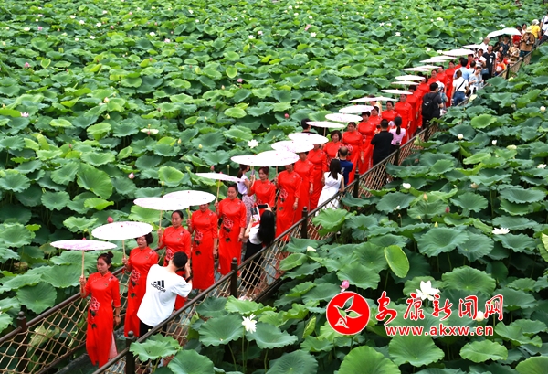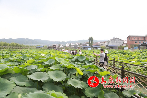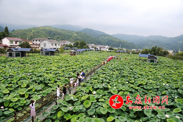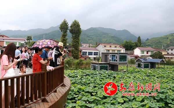 近日,石泉县池河镇五爱村的荷塘内,不同种类的荷花竞相开放、争相斗艳、清香缕缕,观景平台、玻璃栈道和紫藤花长廊更是增添了几分情趣,前来观光的游客络绎不绝,或是祖孙几代漫步荷塘,或是亲朋好友信步栈道,或是摄影爱好者坐等芙蓉出水。(通讯员 任国路 摄)h3u安康新闻网