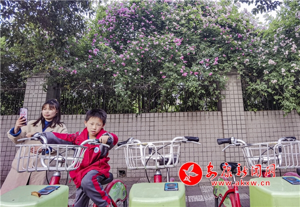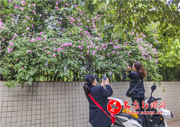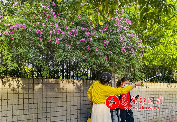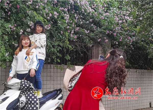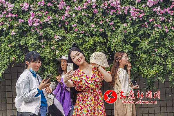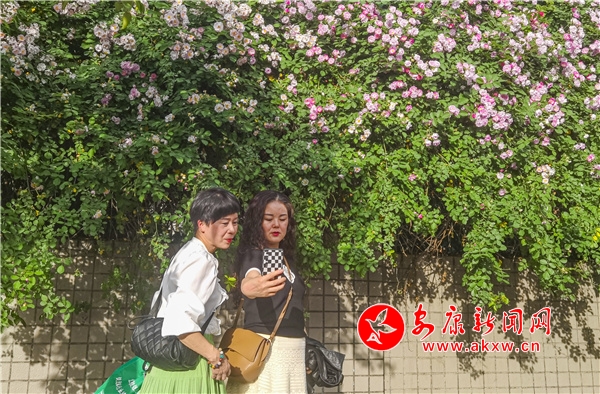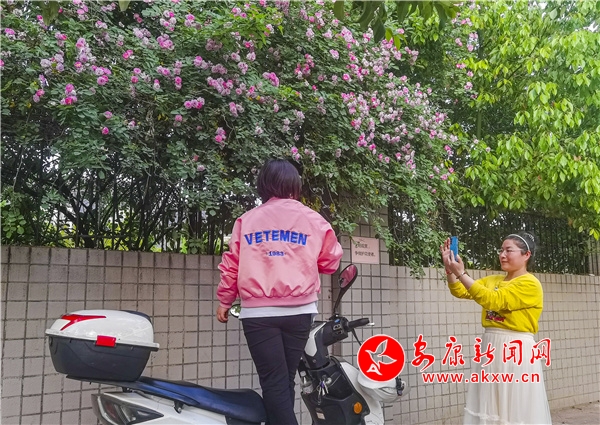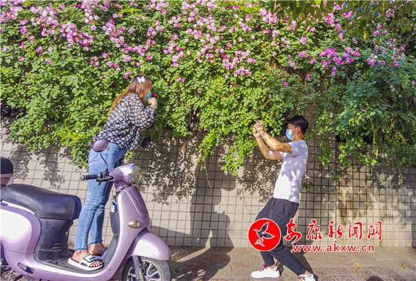 近日,安康东堤外的汉宁宫院墙上的蔷薇花盛开,成了安康的网红打卡地,每天吸引了数百人到此赏花拍照。(图文/陈德模)