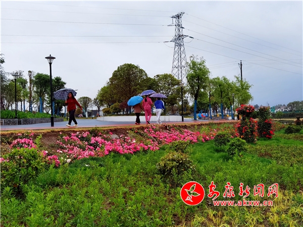 5月14日,汉阴县迎来了2022年立夏后的首场降雨。在汉阴县花月湾迎宾公园,鲜花盛开,铺满路边。市民们行走在雨中,呼吸着春雨的气息,闻着鲜花四溢的香味,锻炼着身体,心旷神怡。(图文/林爱铭)g8h安康新闻网