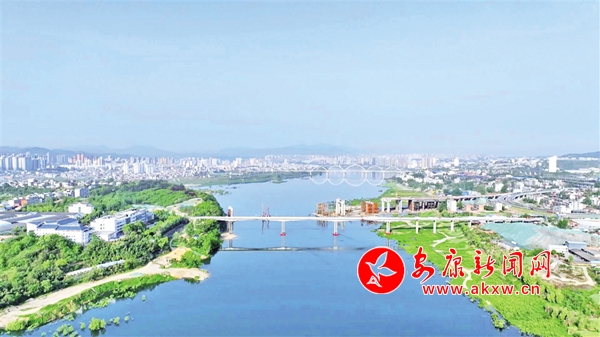4月16日,安康城东。四桥在静谧的汉江上倒映出五环,远处的西城阁和滨江大道与鳞次栉比的住宅小区形成了一幅城市风景画。二桥、四桥相互辉映。 陈梅 摄