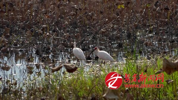 近日,汉阴县双乳镇千亩荷塘再次迎来朱鹮群,洁白的羽毛与艳红头冠在秋日阳光下格外灵动,一派安逸自在的景象,绘就人与自然和谐共生的生动画卷。(通讯员 黄智发)
