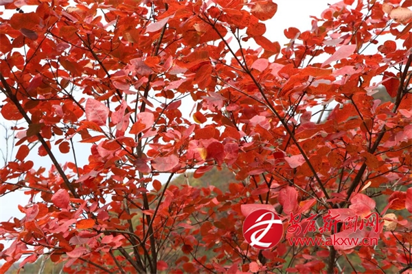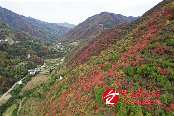 初冬时节,地处秦岭南麓的汉滨区早阳镇境内,满山的红叶把山村装扮得美如一幅画,引得众多游客和市民来这里赏红叶、观美景,尽享生态之美。图为无人机视角下的早阳红叶美景。 (通讯员 周涛) Kmu安康新闻网