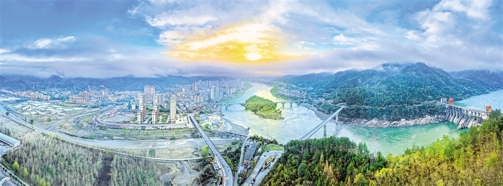 11月19日,石泉县城晨光初照,金辉洒落汉江,雾从群山间奔涌而出,冬景美不胜收。董长松 摄
