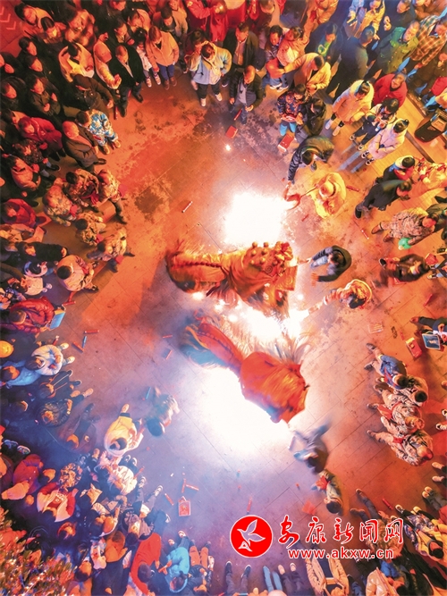 2月16日,在石泉县秦巴风情园景区,当地民间艺人的舞龙舞狮表演,吸引了众多市民和游客观看欣赏。许兵 摄EVM安康新闻网