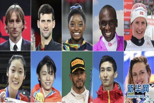 新华社体育部评出2018年国际十佳运动员。拼版照片上排从左至右为:卢卡·莫德里奇、诺瓦克·焦科维奇、西蒙·拜尔斯、埃鲁德·基普乔格、比约根;下排从左至右……
