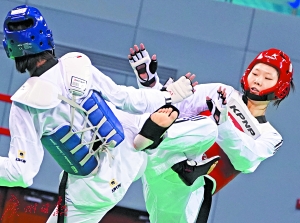 张梦宇(右)在跆拳道女子67公斤级为广东代表团再添一金。新华社记者 郭晨 摄