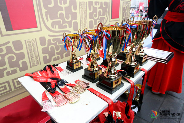 在今年赛事的主会场,静态兵马俑的展示及秦朝打扮的士兵让跑友一进入瓮城就能感受到浓郁的历史氛围。在城墙赛道的公里柱上,铜车、兵马俑、甲胄、秦币等大秦的标志性元素清晰可见,让跑者始终置身于古代景致之中。赛道终点处还有穿着秦朝服饰的美女,为完赛跑者亲手挂上奖牌,见证跑者的荣耀时刻。