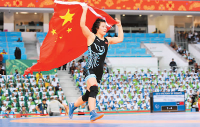 9月25日,在第五届室内与武道运动会自由式摔跤女子58公斤级比赛中,中国选手裴星茹以3比1战胜吉尔吉斯斯坦选手德内别科娃,获得金牌。图为裴星茹身披国旗庆祝胜利。HPD安康新闻网