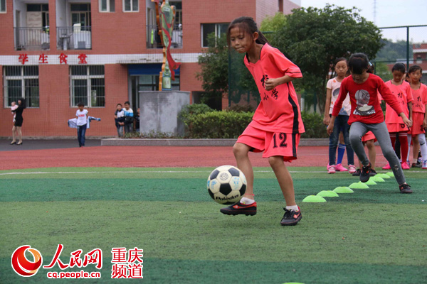 9月8日,重庆石柱县三河镇小学五年一班教室内,墙上的时钟指向下午四点,走廊上的下课铃准时打响,小颖(化名)拿着书包,迅速跑到球场边的更衣室,换上球衣、球袜、球鞋。看着镜子中的自己,小小的个子有着认真的表情和坚定的眼神,她满意的点点头,来到了足球场上,围绕着教练放置的足球训练标志碟开始热身。