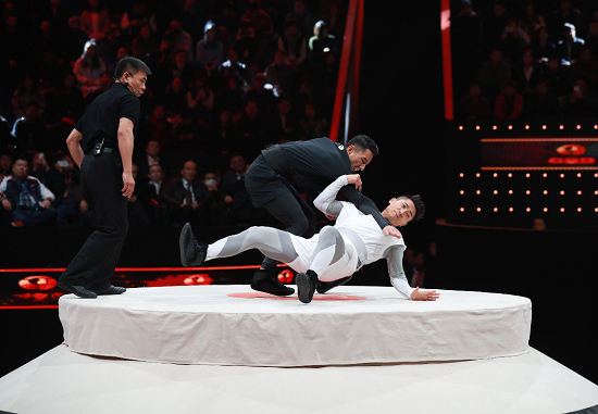 推下擂台,背部着地,双双摔出场外……两位70公斤级选手率先登场,刚柔并济中体现力量与技巧,比赛节奏紧张、胜负扣人心弦。丰富的技术动作,复杂的劲道变化,让熟悉跆拳道、柔道和拳击的观众,见识了不同于摔、打、踢的太极技击,现场欢呼加油声不断。