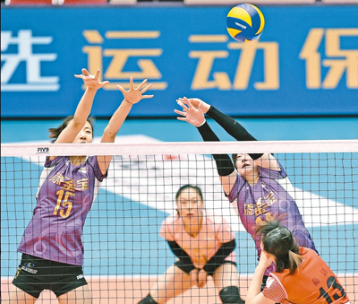11月28日,天津女排球员王媛媛(左一)和陈丽怡(右上)在比赛中拦网。9fb安康新闻网