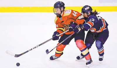 | 12月10日,深圳昆仑鸿星队球员(左)和深圳万科阳光队球员在CWHL(加拿大女子冰球联赛)常规赛比赛中拼抢。 |