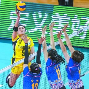 1月23日,辽宁广电沙鸥队球员王一梅(左)在与北京汽车队比赛中进攻。 新华社记者 潘昱龙摄