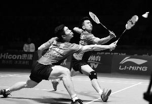 厦门特房队刘成、郑思维(右)在男双比赛中。 本报记者 王宪民摄