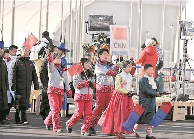 参与今天升旗仪式的中国体育代表团约有80人,在升旗后的表演中可谓是尽显韩国特色,从冬奥村村长到表演人员都是身着韩国民族传统服装,而且很好地将现代与传统结合起来,尤其特别的是在结束时表演人员尽邀参与升旗仪式的中国体育代表团集体互动,从而使得现场变成一场载歌载舞的欢乐“趴”。
