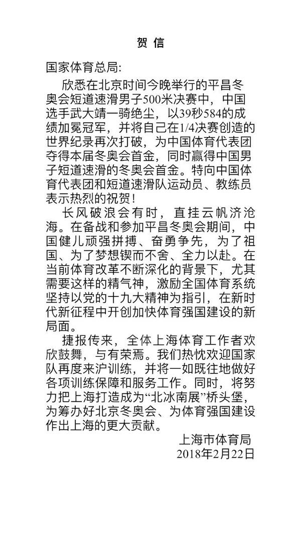 人民网平昌2月22日电(记者 胡雪蓉) 当地时间2月22日,武大靖在2018年平昌冬奥会短道速滑男子500米决赛中获得冠军,这也是本届冬奥会上中国代表团获得的首枚金牌。赛后,上海市体育局向国家体育总局发来贺电,祝贺中国代表团取得金牌。CjK安康新闻网
