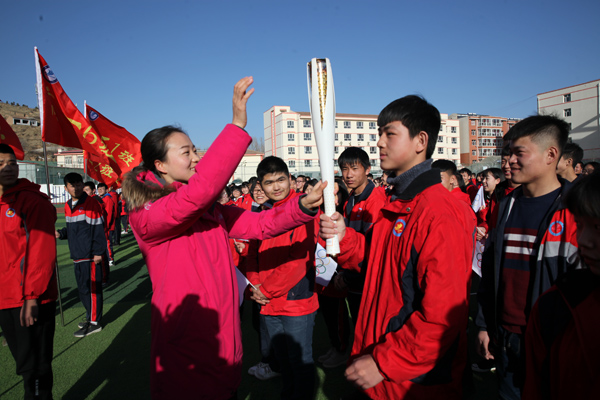 崇礼一中的学生们观看上届冬奥会火炬,并了解冬奥会知识。