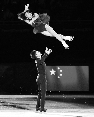 隋文静(上)、韩聪在平昌冬奥会花样滑冰答谢表演中。 中体在线 鹿麟摄(资料图)