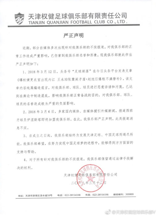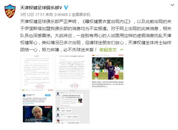 天津权权健官微写道:“天津权健足球俱乐部严正声明,《曝权健更衣室出现内讧》,以及此前出现的关于伊涅斯塔加盟我俱乐部的消息均为不实报道。对于网上出现的此类消息,相关队员也深感震惊。大战将近,一些别有用心的人试图用这样的虚假消息扰乱天津权健军心,类似情况已多次出现,但请球迷朋友们放心,天津权健全体将士始终团结一心,努力拼搏,必不负球迷关爱!”