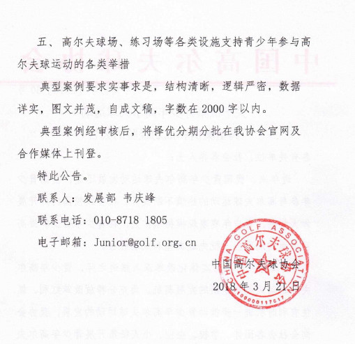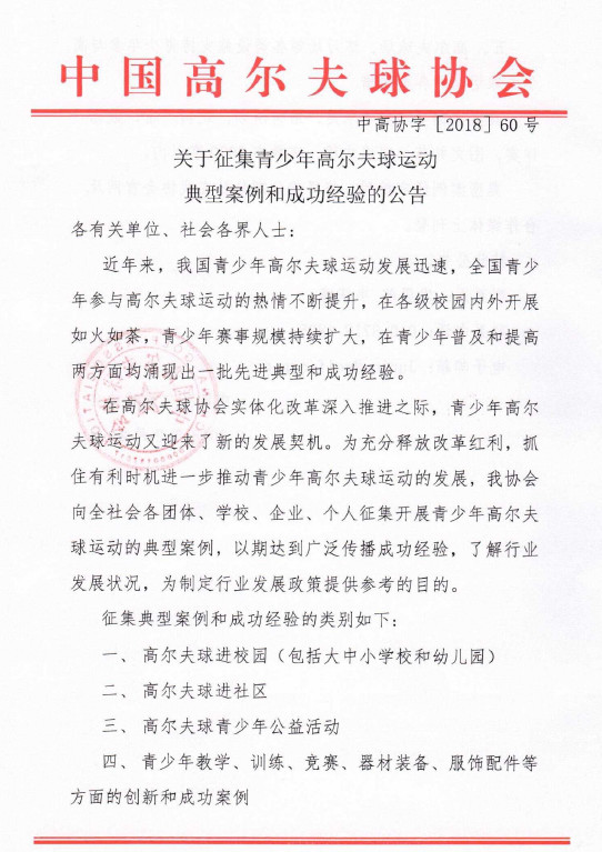 人民网北京3月22日电(杨乔栋)昨天,中国高尔夫球协会发布《关于征集青少年高尔夫球运动典型案例和成功经验的公告》(简称“公告”)。公告指出,在高尔夫球协会实体化改革深入推进之际,青少年高尔夫球运动又迎来了新的发展契机。为充分释放改革红利,抓住有利时机进一步推动青少年高尔夫球运动的发展,我协会向全社会各团体、学校、企业、个人征集开展青少年高尔夫球运动的典型案例,以期达到广泛传播成功经验,了解行业发展状况,为制定行业发展政策提供参考的目的。g76安康新闻网