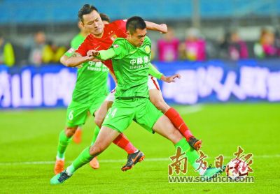北京国安队球员张瑀(前)在比赛中防守广州恒大队球员郜林。新华社发