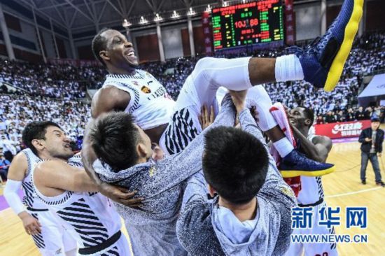 ↑辽宁队球员在赛后将队友哈德森(上)抛起,庆祝夺冠新华社记者潘昱龙摄