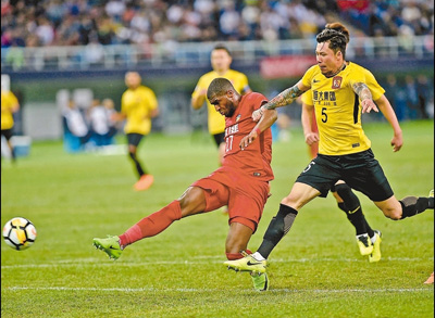| 5月8日,天津权健队球员莫德斯特(左一)在比赛中射门。 |
