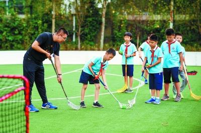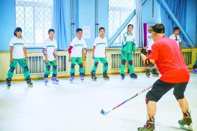 ▲中关村二小的学生在上旱地冰球课。