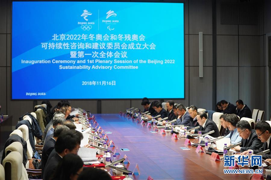 ↑11月16日,北京2022年冬奥会和冬残奥会可持续性咨询和建议委员会成立大会暨第一次全体会议在北京冬奥组委首钢办公区召开。 图为大会现场(11月16日摄)。 新华社记者鞠焕宗摄