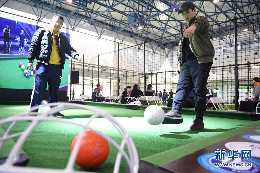 两位参观者在体验台式足球。 新华社记者鞠焕宗摄L6E安康新闻网