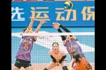 11月28日,天津女排球员王媛媛(左一)和陈丽怡(右上)在比赛中……