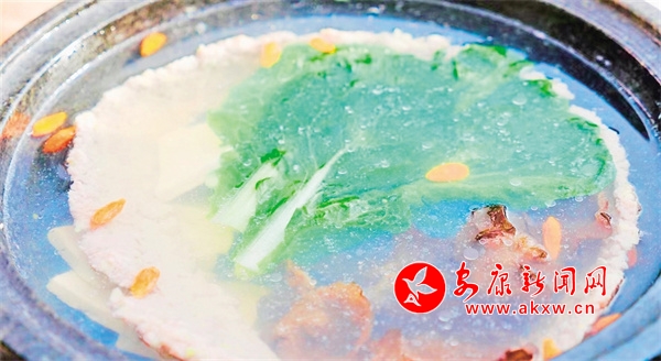 “白火石汆汤是我跟我祖父和父亲学的手艺,13岁开始学做厨,白火石汆汤里面主要用到新鲜的猪肉,加葱姜、蛋清、盐、鸡精以及料酒、生粉、蛋清,将其剁成肉泥,贴到陶盆里面,上厚下薄,里面陆续放上木耳、小青菜、豆腐,然后把石头烧红之后放进陶盆内的纱布中,只消几分钟,一道美味可口的白火石汆汤便做好了。”解远平一边准备食材,一边向笔者介绍着白火石汆汤的做法。
