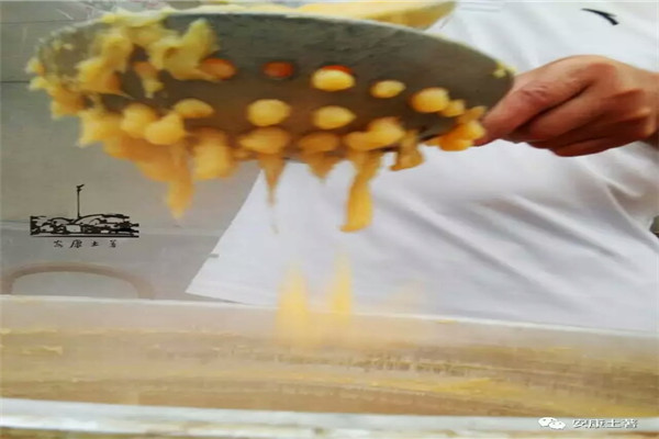 熬煮熟的粉/面浆,即将迎来“名副其实”的关键一步,大勺子舀起粉/面浆,倒入漏勺,用勺底来回碾压,一条条“小鱼”就从漏勺底下跃入锅中,随着水花起舞。
