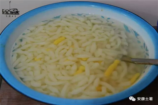 另一种安康的,叫“浆水面鱼儿”,面鱼儿是有黄色、白色两种,黄色用包谷面、白色用米粉或菱角粉做成,配着浆水、浆水菜、大蒜辣子、炒韭菜和油泼辣子吃。