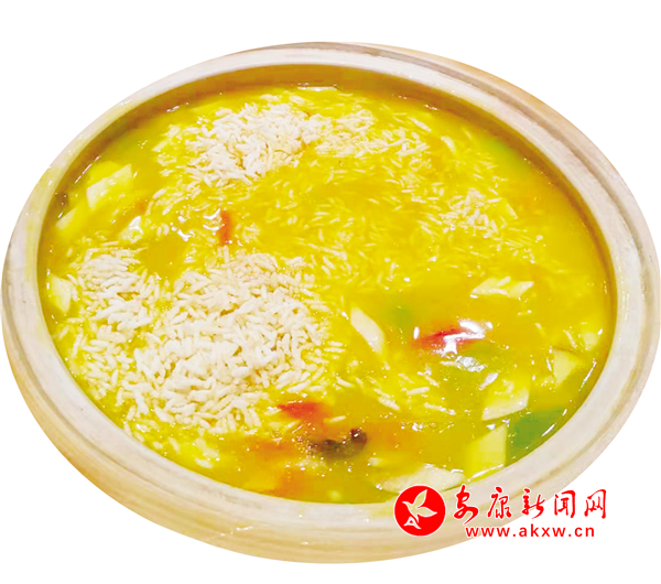 这是一道舌尖美味,制作时提前把海参、青笋、杏鲍菇、红萝卜切好汆水,备好墨鱼花、虾仁、棒骨高汤、南瓜泥、咸蛋黄,炸好香米,客人餐前,把炸好的香米复炸香脆装盘,再把鸡油、咸蛋黄、高汤和南瓜泥放入锅内翻炒,然后倒入海参、青笋、杏鲍菇、红萝卜、墨鱼花、虾仁等食材,烧开勾芡,调制成浓香金汤,起锅装盆,端到客人餐桌,当着食客的面将脆米倒入盛装金汤的土盆里,搅拌均匀即可。这道菜看着五颜六色、金黄油亮,吃着养胃养颜,汤汁鲜美,营养丰富。