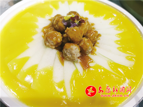 推荐理由:这道菜将冬瓜片成薄片,依次摆放在盘中,猪肉和虾泥混合而成的丸子搅打上劲后,摆在冬瓜的中央,盖上保鲜膜上锅蒸熟后,在冬瓜周围淋上一圈秘制金汤,肉丸则用蚝汁和水淀粉勾芡而成的料汁浇在上面。颜色金黄透亮,因为金汤和肉丸汁水的渗出,冬瓜吃起来带着肉的丰腴,又在回味中夹杂着蔬菜本身的清甜,肉丸弹牙鲜香,教人食之难忘。整道菜品好吃又好看,值得一尝再尝。