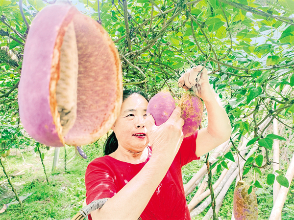远嫁安徽的汉滨区双龙镇谢坪村魏泽会,在外打拼一生,年逾花甲思乡心切,于2018年回到家乡,在老家附近的一条山沟里,栽种了30亩八月炸。今年,八月炸喜获丰收。走进园区,一行行、一架架八月炸藤蔓,挂满了粉红的果实,有的裂开果肉,像极了开怀大笑的娃娃。魏泽会说:“今年产量达到3万公斤左右,因八月炸不易保存,谢坪村第一书记汪道轩和陕西省生态厅环境信息中心驻村干部马祥一起,先后通过网络推介、电商促销和临时售卖点等帮我们销售。”为了最大限度增收,魏泽会已尝试利用八月炸酿酒、榨油等,均已成功,因产量很小,暂未对外销售。
