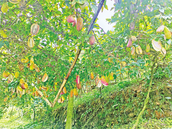 八月炸,中药名称“预知子”,是三叶木通的果实,果子的形状为椭圆形,长得像香蕉,沿腹缝线略弯,又似肾脏。成熟后,露出里面乳白色的果肉,口感甜糯,似冰激凌,富含糖、维生素C和12种氨基酸以及人体不能合成的缬基酸、蛋氨酸、异亮氨酸、苯丙氨酸、赖氨酸和清热利湿、活血通脉、行气止痛的功效。