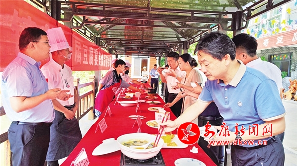活动现场,壹品坊豆腐、王莽山庄、郑家农家乐、胡桃里农庄、舒大嫂农家乐、方氏豆腐坊、财哥豆腐宴等10家农家乐带来的37个美味的菜品一一呈上长条桌,供现场参与人员品鉴。